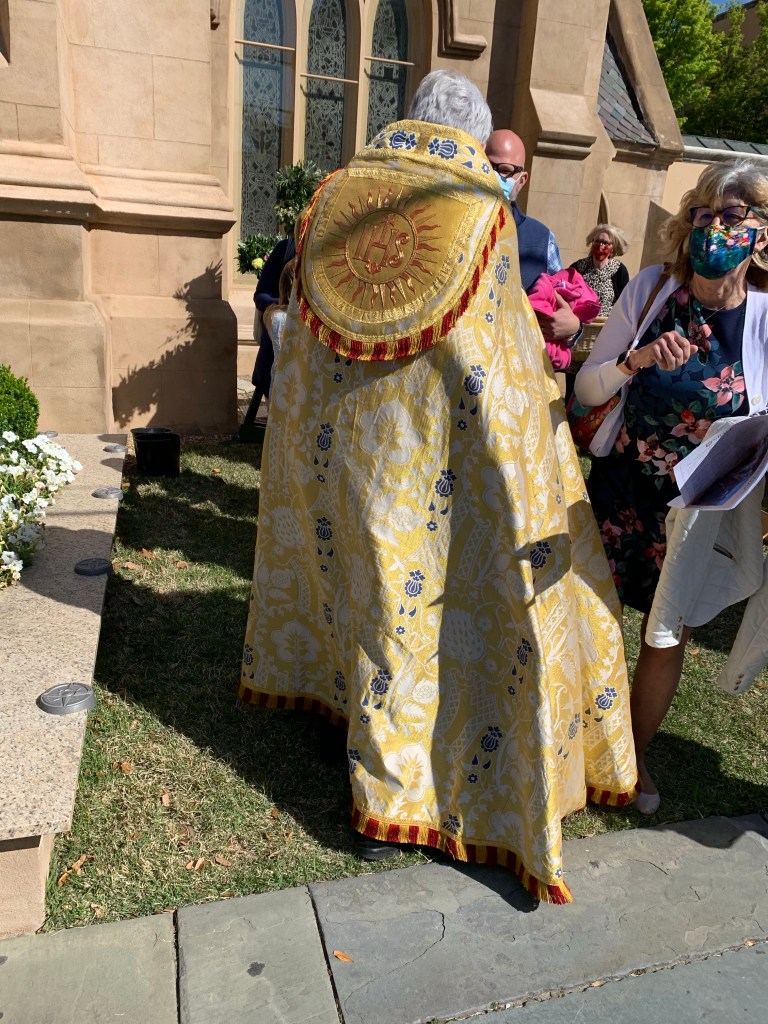 The communion was efficiently served, with the main Reverend leading the group around the entire sanctuary to deliver the sacrament. As in past Sundays, I choose to abstain, as I was not sure of the Episcopal guidelines for partaking of communion. When I politely whispered “no thank you” when he got to me, he said some sort of prayer, and I immediately felt judged by the entire room. Oh well. Similar to my observations at the Catholic service, these service participants changed robes prior to communion. Started with black robes then moved to ornate gold and white robes. They slip into these back rooms behind the altar for the wardrobe change, almost like a Broadway show. See pic below of the final robe worn during the service outside the church.